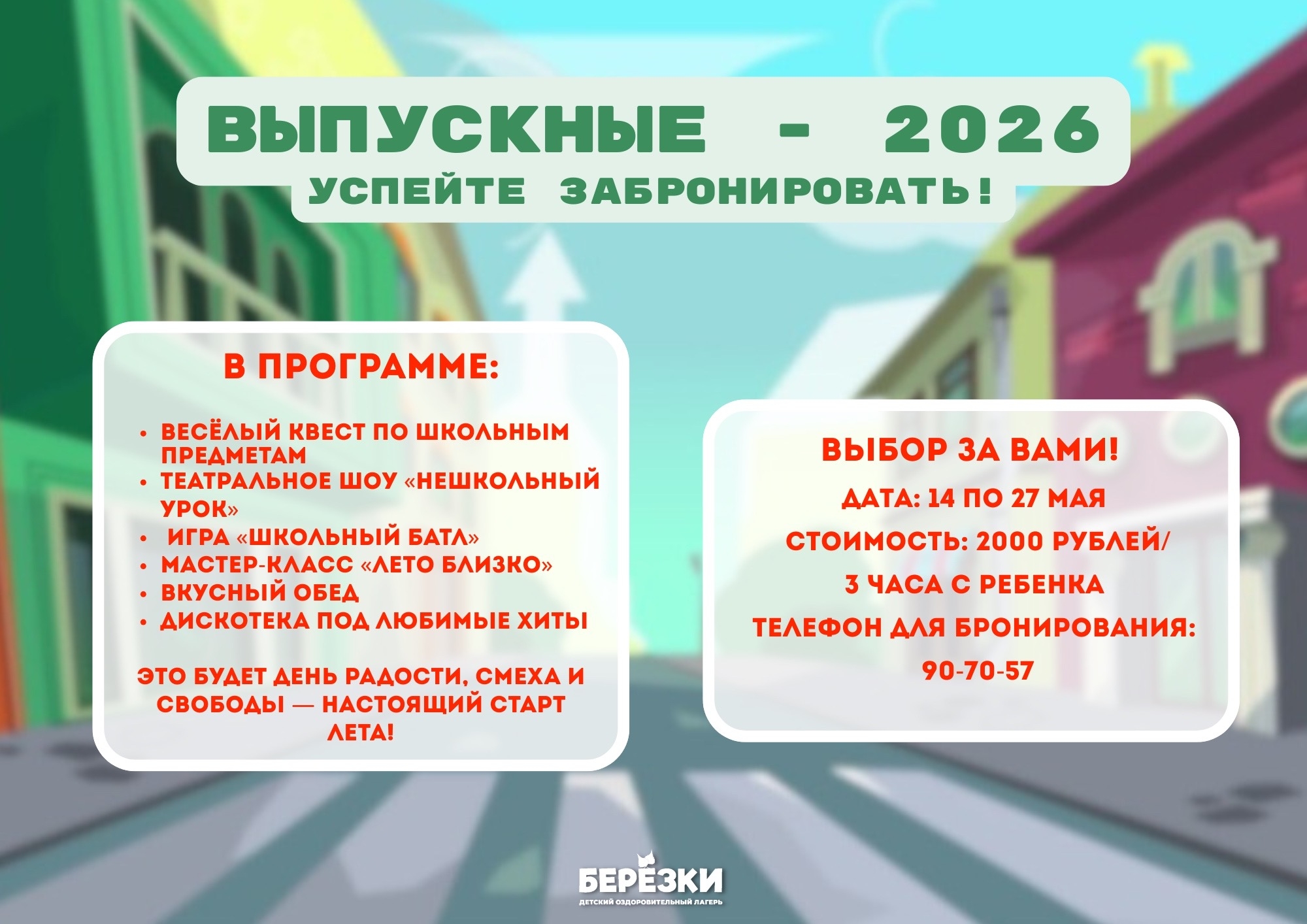 С 14 по 26 мая 2026 года центр активного отдыха «Березки» приглашает выпускников на праздничную программу «Побег в лето». Это событие станет грандиозным финалом учебного года и торжественным началом самых долгожданных каникул.